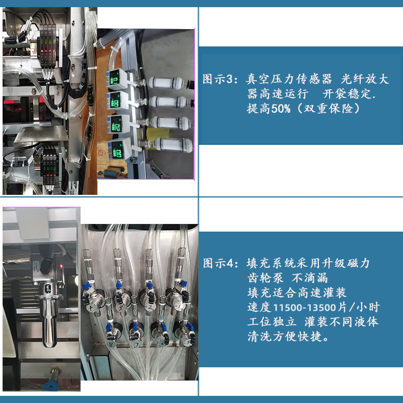 1、自動下袋、自動填充、自動封口、打碼、成品輸出、自動計數(shù),無袋不充填,無袋不封口;