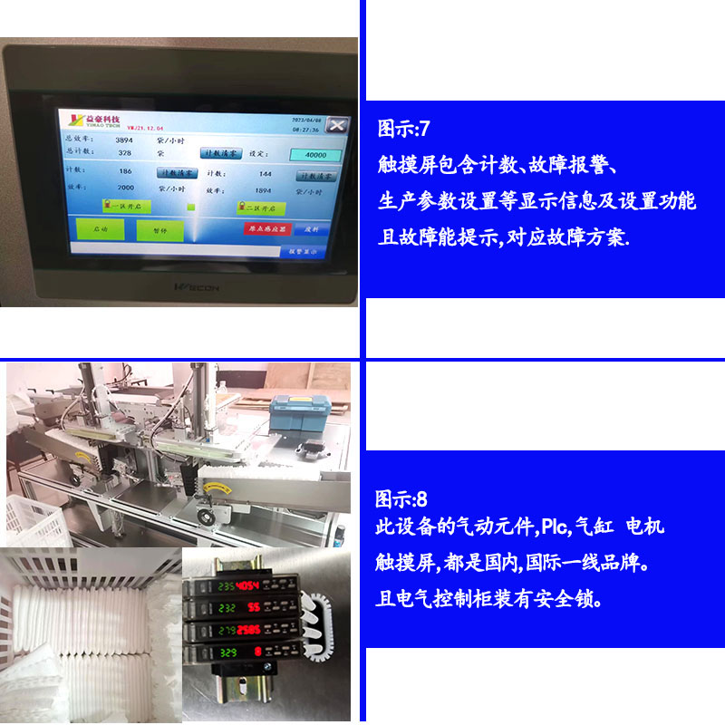 4.PLC+液晶觸摸屏控制操作,可在觸摸屏上輕松設(shè)置設(shè)備參數(shù),產(chǎn)量和出錯(cuò)信息清晰直觀;
